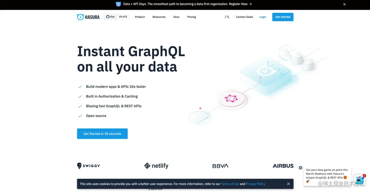 Hasura 是一款 GraphQL 引擎,性能非常高,主要是为Postgres 数据库提供 GraphQL API。