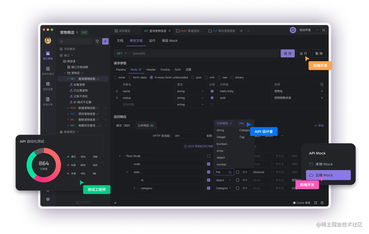 - 集成了API 文档、API 调试、API Mock、API 自动化测试 API 一体化协作平台