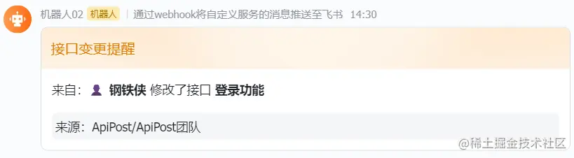 在Apipost中配置消息推送功能后,接口信息发生变更时,你可以第一时间收到API变更通知。这样就能够避免因为接口变更导致的工作受阻和重复动作。