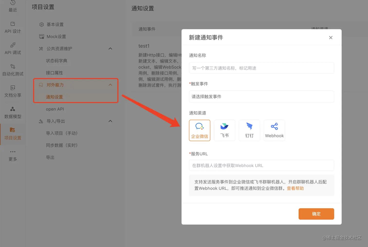 在「项目设置」-「对外能力」-「通知设置」中创建通知事件,选择触发事件、通知渠道和 Webhook URL,就可以 API 变更通知了