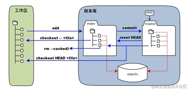 - **暂存区:**英文叫 stage 或 index。一般存放在 .git 目录下的 index 文件(.git/index)中,所以我们把暂存区有时也叫作索引(index)。