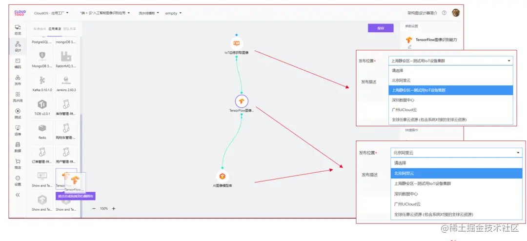 在我们的CloudOS 2.0中,一个应用的设计态可能包含多个组件,有的组件需要运行在云端,有的组件需要运行在边端。我们只需要在CloudOS中,以可视化的方式,将不同的组件交付到不同的资源池就好了。