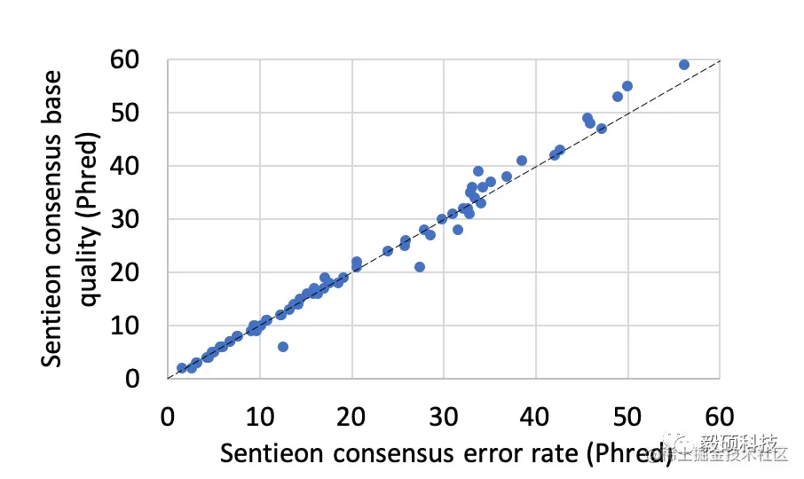 在我们的模拟数据测试中,我们分析了统计模型给出的质量值和实际的错误率之间的关系,针对所有模拟的情况,包括不同的单链、PCR和测序错误率。从上图统计中我们发现,我们给出的质量值高度准确的体现了这些统计过程的所引入的随机错误。这证明了Sentieon UMI不但在建立consensus序列上有极高的正确性,同时也能为每个consensus序列提供非常有价值的质量值。