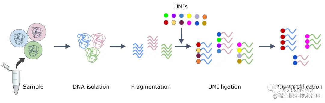 单分子标签技术(Unique Molecular Identifier, UMI)被广泛应用在极高灵敏度的NGS检测中,尤其是目前炙手可热的循环肿瘤DNA (ctDNA) 检测。ctDNA作为一种非侵入性的肿瘤生物标志物,以其极高的灵敏度,可用于癌症早筛早检,治疗反应的实时监控等。因此,大量的研究工作围绕ctDNA而展开。然而,由于传统NGS检测灵敏度受限于PCR和测序的错误率(~1%),必须通过UMI来保证ctDNA检测的高灵敏度和特异性。