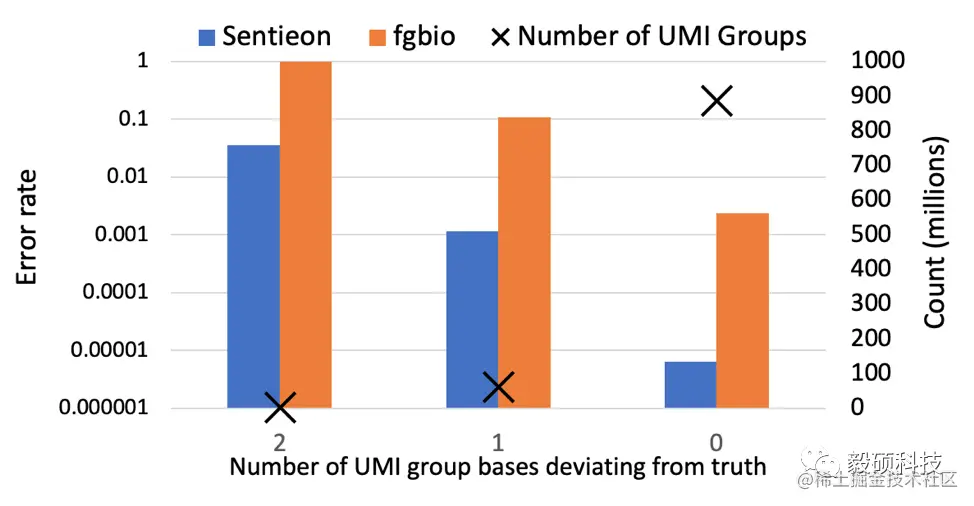 因为在PCR过程中我们随机抽取了三个序列,所以,每个位点将从三个bases合并成一个consensus base。为了更仔细的对结果进行评估,我们把每个位点上的pile up分成三类:较为常见的情况下3个碱基全部一致(如AAA), 2个一致(如AAC),和较为罕见的3个都不同的情况(如ACG)。从上图的结果中可以看出,在所有这3种情况下,Sentieon UMI consensus流程的错误率都比fgbio降低了两个数量级或以上。这里需要注意的是,即使在输入序列的三个碱基全部一致的情况下,Sentieon和fgbio流程均还有错误。这是因为虽然一个原始碱基,例如C,因为PCR和测序错误变成三个完全与C不同的,例如AAA,的可能性非常小,但是在大量的模拟PCR扩增数据情况下,我们依然可以看到这样的情况发生。