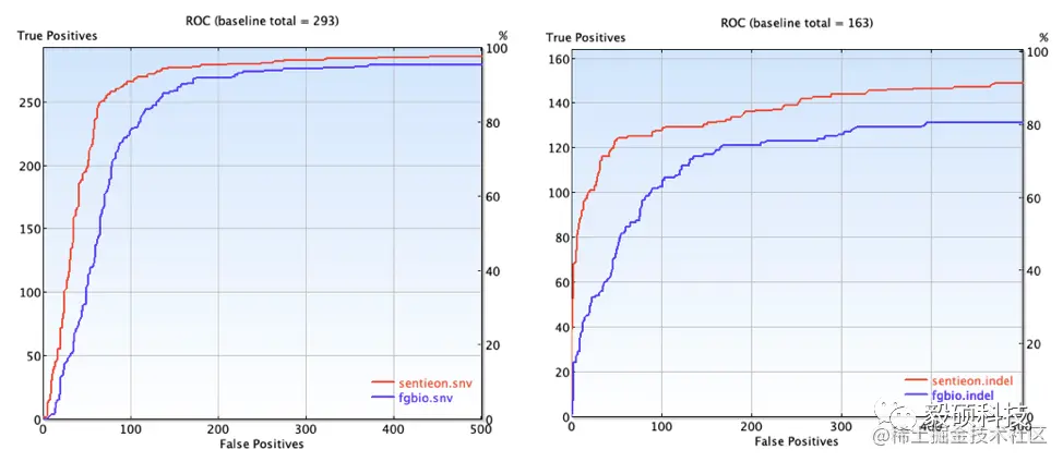 从结果可以看出,无论是SNV(左图)还是Indel(右图),Sentieon UMI流程的准确度均更高。从F1 Score来看,SNV方面Sentieon vs Fgbio是0.823 vs 0.748,Indel方面Sentieon vs Fgbio是0.742 vs 0.573。值得一提的是,Sentieon软件流程按照模块化设计,consensus之后的bam文件可以输入到各类变异检测软件,具有良好的兼容性。