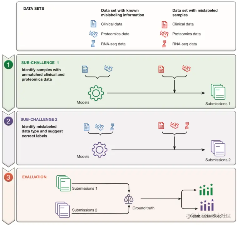 在2018年的FDA多组学数据样本错误标记校正的挑战赛中,主办方共提供了160位病人的临床数据,记录了每个样本的临床特征(样本性别,肿瘤MSI评分),4118蛋白组表达量及17447 mRNA数据。其中以80个样本作为训练集,其余作测试集,每组数据集中包含12个错误标签。目的是通过分析不同组学数据之间的相关性,找出错误标签的数据并进行纠正。本次挑战赛的难点在于如何对缺失数据进行填充,以及在面临小样本,高维度问题时的解决方案。