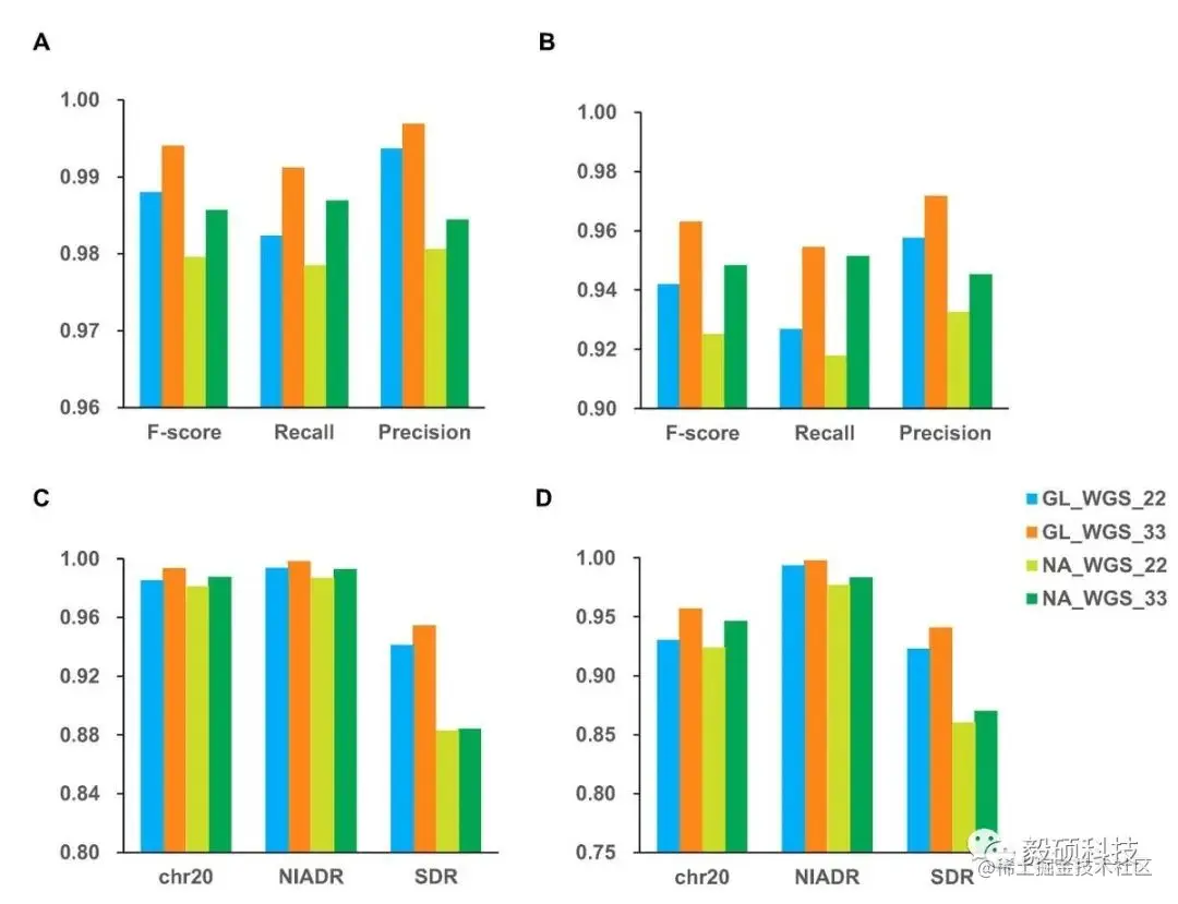 - 对两组高置信区域进行评估:NIST truth v4.2.1 排除同聚物长度 >=11 bp 的高置信区域,Ultima 高置信区域(不包括额外的串联重复区域)。