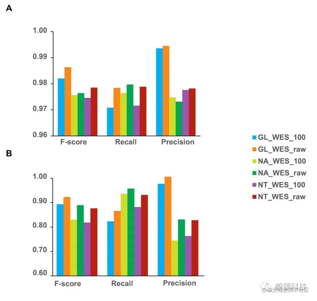 - 基于WES数据,Genolab M+DNAscope变异检测的灵敏度(Recall)与NovaSeq/NextSeq+GATK检测结果类似,但是变异检测的特异性(Precision)大幅度领先,最终的综合F-score也较高,可以在100x的深度下达到NovaSeq/NextSeq平台更高深度才能达到的准确率。
