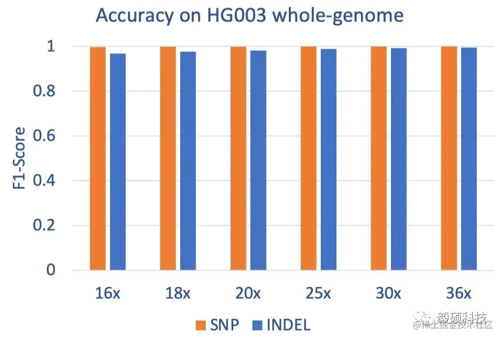 16x HG003:F1 ~0.997 for SNP, ~0.968 for INDEL;