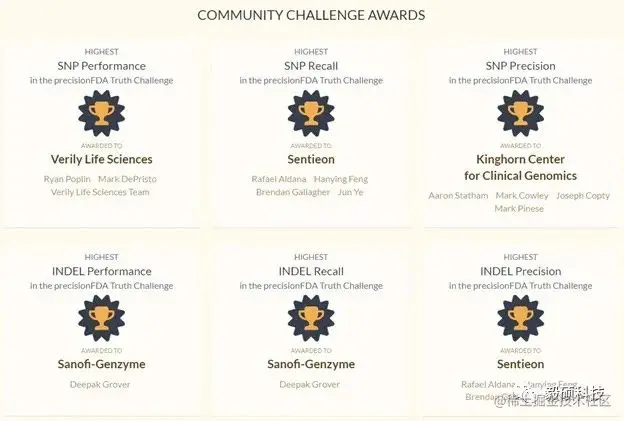 在分析精度方面,Parabricks官方博客此前报道了其变异检测结果的准确性与GATK相当(F1 scores)。而Sentieon不但提供与GATK一致结果(一致性达99%以上),更是PrecisionFDA Truth Challenge的连续冠军。在第二届PrecisionFDA Truth Challenge比赛中更是赢得了4个分项赛冠军。