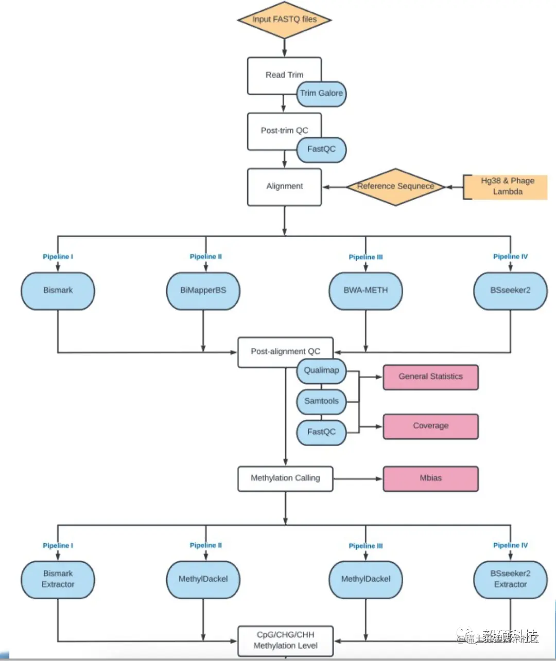 - 比对后处理:使用不同的模块进行甲基化位点调用和CpG甲基化水平识别。