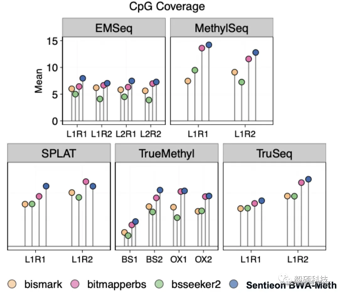 - 与其他测试工具相比,Sentieon BWA-Meth在CpG位点提供了更高的测序覆盖率。