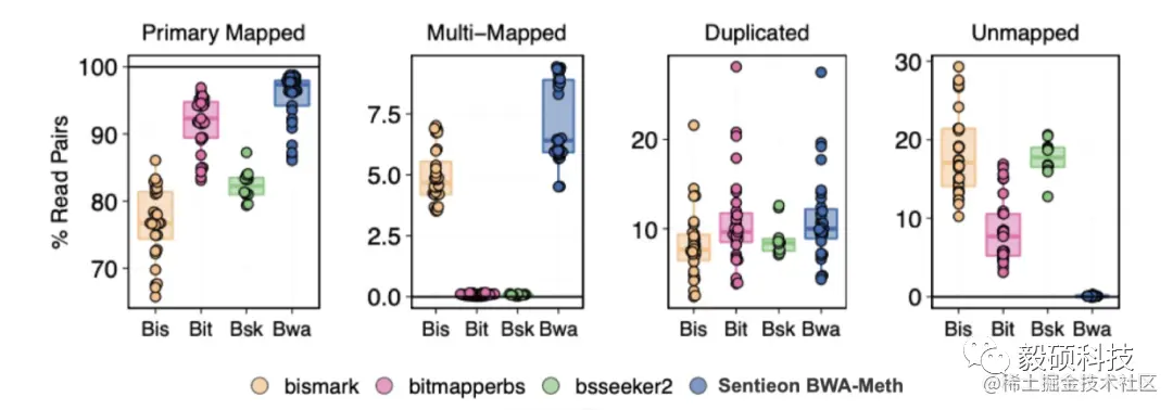 - Sentieon BWA-meth具有最高的主要映射率和最低的未映射率。