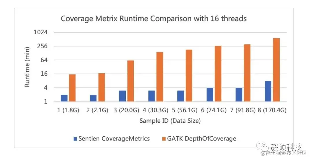 比如在统计全基因组数据质量时常用的“xx%区域的覆盖深度超过15x”这样的指标,就可以由这个质控模块给出。如下图所示,与开源软件对比,”CoverageMetrics”模块的提速在10-80倍之间。