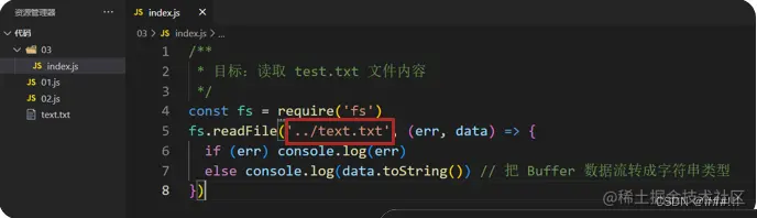 __dirname配合 path.join() 来得到绝对路径使用const fs = require('fs') console.log(__dirname) // D:\备课代码\2_node_3天\Node_代码\Day01_Node.js入门\代码\03 // 1. 加载 path 模块const path = require('path') // 2. 使用 path.join() 来拼接路径const pathStr = path.join(__dirname, '..', 'text.txt') console.log(pathStr) fs.readFile(pathStr, (err, data) => { if (err) console.log(err) else console.log(data.toString()) }) -