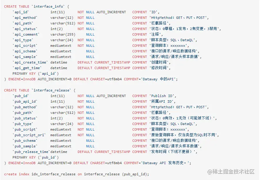 Dataway 需要两个数据表才能工作,下面是这两个数据表的简表语句。下面这个 SQL 可以在 dataway的依赖 jar 包中 “