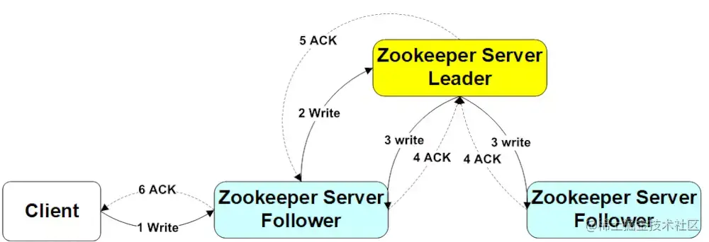 当一个客户端进行写数据请求时,会指定ZooKeeper集群中的一个server节点,如果该节点为Follower,则该节点会把写请求转发给Leader,Leader通过内部的协议进行原子广播,直到一半以上的server节点都成功写入了数据,这次写请求便算是成功,然后Leader便会通知相应Follower节点写请求成功,该节点向client返回写入成功响应。