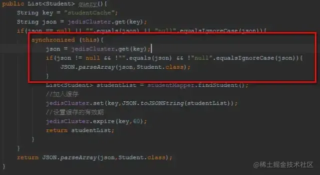 上面代码,在缓存有数据时,让查询缓存的请求不必排队,减小了同步的粒度。但是,仍然没有解决缓存击穿的问题。