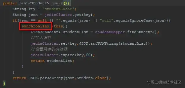 如果synchronized加在方法上,使得查询请求都得排队,本来我们的本意是让并发查询走缓存。也就是现在synchronized的粒度太大了。