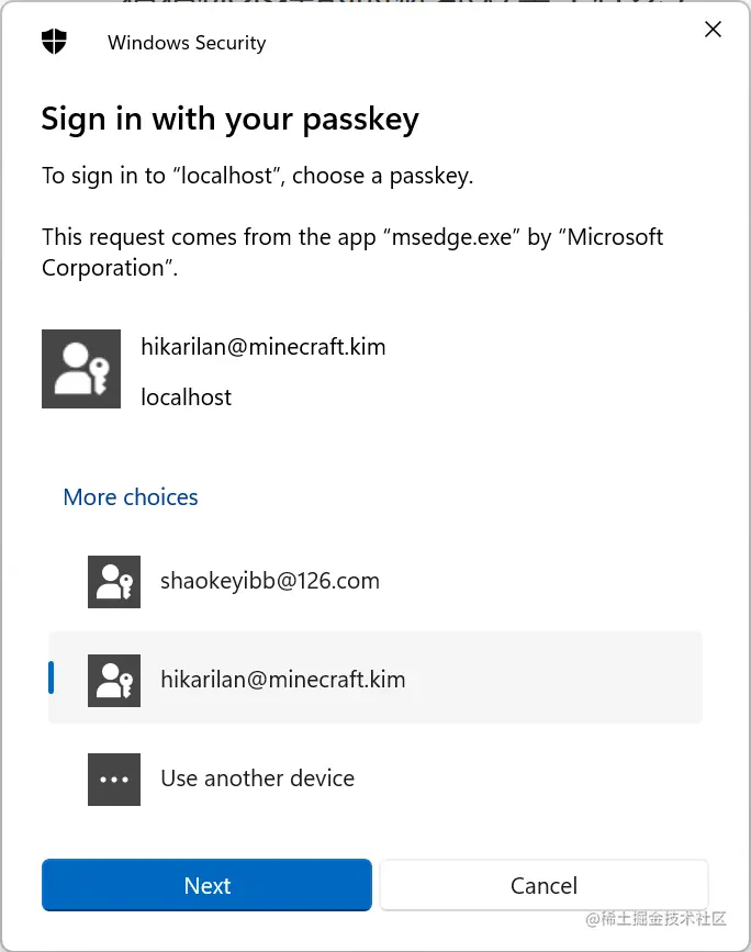 navigator.credentials.get()方法,传入上一步获取的 options,浏览器调用操作系统接口弹出对话框要求用户选择进行身份验证的密钥并进行身份验证; - 如果用户身份验证成功,那么浏览器则应该向服务器发起请求,返回上一步调用方法的返回值;服务器将对该值进行验证,如果验证通过,则凭据认证成功,服务器可在更新密钥信息后将用户登录到站点(或者通过 2FA 验证)。