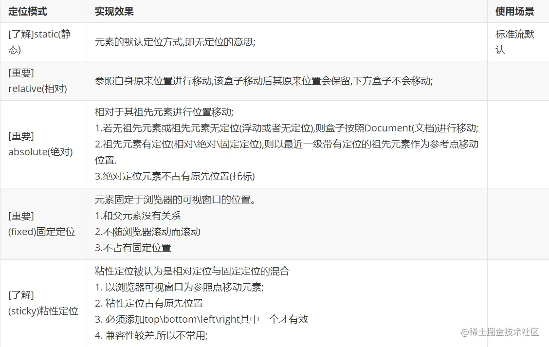 position属性是用来设置定位模式的,可选值有static、relative、absolute、fixed、sticky,关于这些定位模式的实现效果以及使用场景如下: