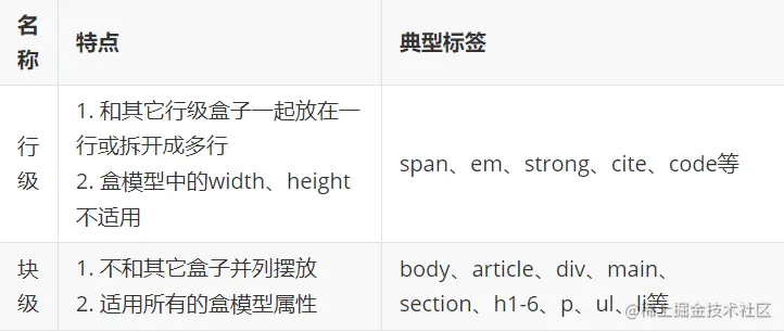 常规流存在行级、块级两种常见的元素布局规则,其特点和典型标签如下: