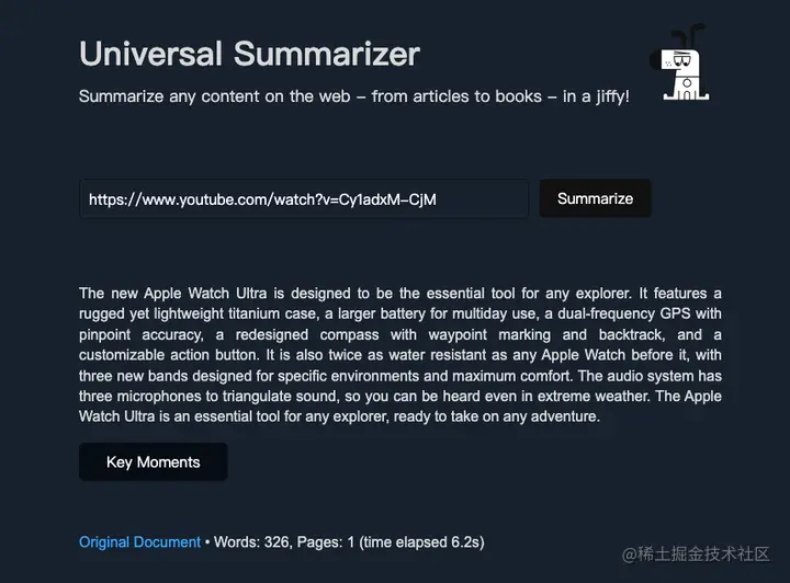 将 Apple Watch Ultra 的官方宣传片的网址输入进去,它很快就把重要卖点都勾勒出来了。