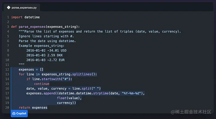 大多数时候,你写下测试用例的名称,然后 Copilot 就可以填写其他所有内容。当你没有搜索正确的 RegEx 来解析字符串,而是编写一条注释来解释你希望 RegEx 做什么,然后 Copilot 就可以编写 RegEx。