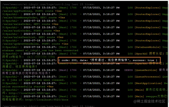 输入 pm2 log 查看详细日志、看到下图表示成功!