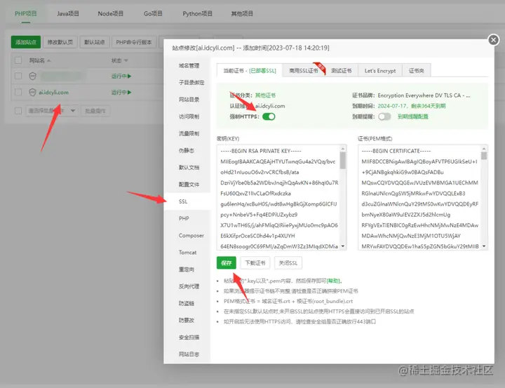 如果没有证书,就使用宝塔免费证书,申请Let's Encrypt