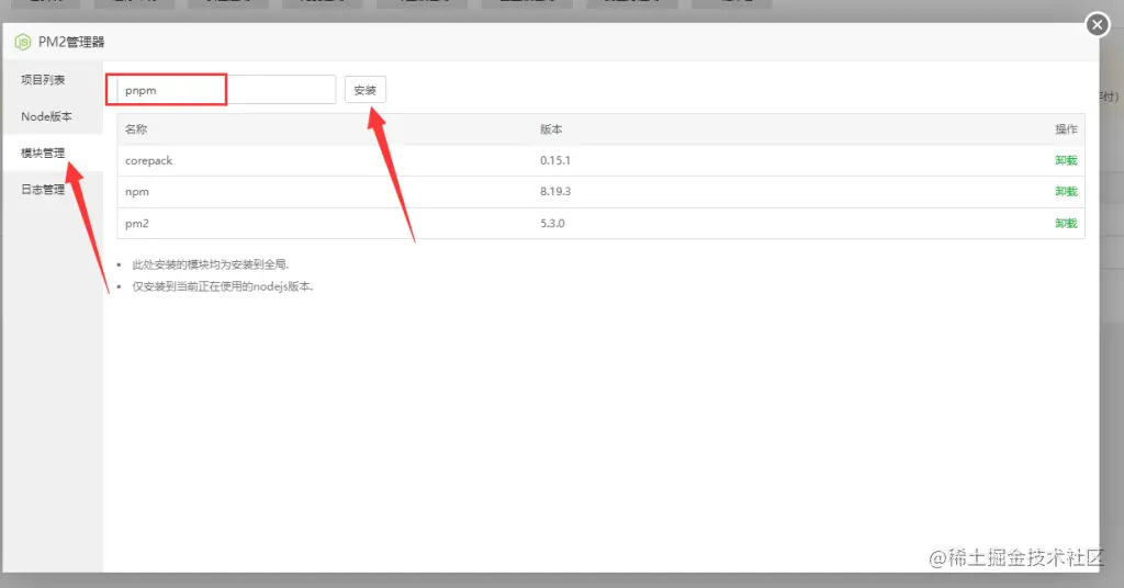 然后安装 pnpm、pm2 模块