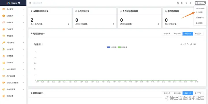 默认前台地址为域名地址 默认后台地址则为 域名地址/sparkai/admin 默认超级管理员账号是 super spark123
