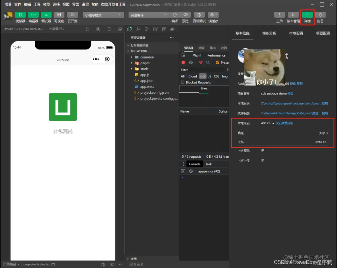 本文通过实际demo进行uniapp小程序拆包,通过分析项目主包大小,查看官方文档,按照功能划分进行子包拆分,如果还有博友存在疑问或者不理解可以在上方与本狗联系,或者查看本狗发布在上方的代码,希望可以帮到大家。