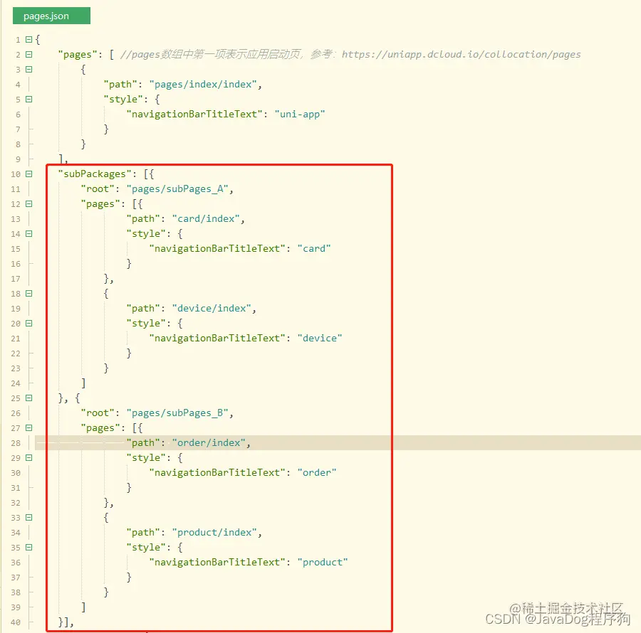根据上一步拆分的包路径,进行配置文件的调整,此处注意"subPackages" 要和 "pages" 同级