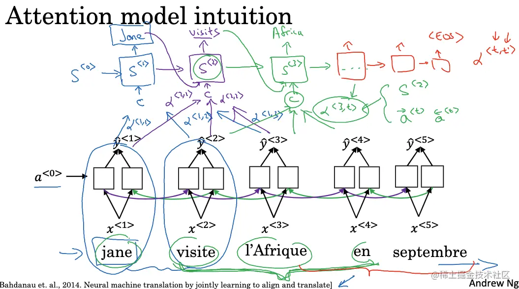 要实现这个注意力机制模型,我们需要首先假设有一个输入句子,我们用双向RNN、双向GRU或双向LSTM对每个词进行特征计算。网络的前向运行可以得到各个时刻的激活状态,以及反向运行的激活状态。在简化记法中,我们将每个时间步长中由双向RNN的前向和后向运行得出的特征结合表示为 a(t),其中t代表时间步长。