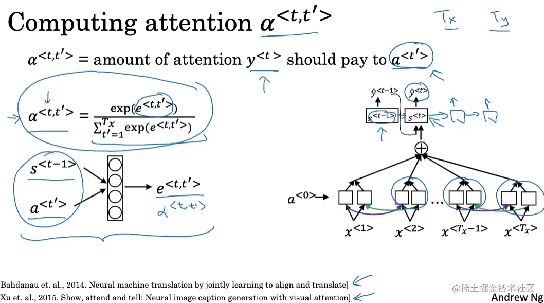 - 为了计算这些注意力权重,我们可以使用一个小型神经网络。这个小型神经网络会查看RNN在生成上一次翻译时的隐藏状态,以及每个位置的词的特征。这个小型神经网络会学习这个函数,我们可以使用梯度下降法来训练这个小型神经网络。