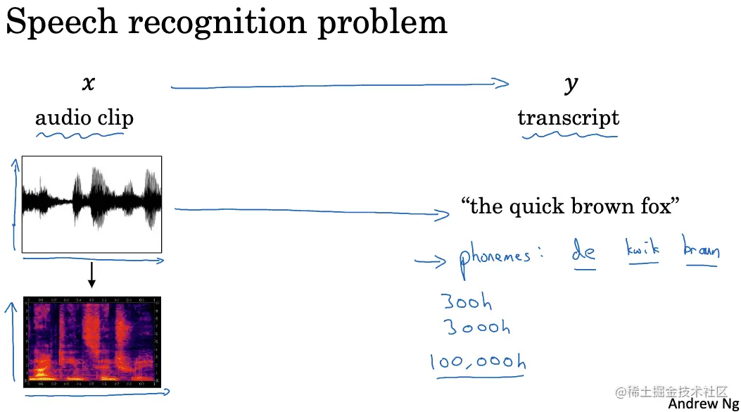 在语音识别的发展历程中,研究者们曾经使用音素来构建语音识别系统。音素是语言学上的基本声音单元,语言学家们尝试使用这些基本单元来转写音频。然而,在端到端深度学习的应用下,研究者发现不再需要这种音素表示法,而是可以直接将音频剪辑输入系统,然后输出相应的文本,而无需使用这些手工设计的音素表示。使用大型数据集对语音识别系统进行训练对此起到了关键作用。最好的商业系统现在训练的数据量已经超过了100,000小时。
