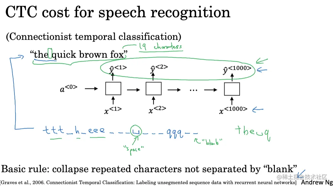 在建立语音识别系统时,我们可以采用注意力模型,也可以使用CTC(Connectionist Temporal Classification)损失函数。CTC损失函数可以允许模型生成重复的字符,而这些重复字符之间可以插入特殊的空字符。通过压缩未被空字符分隔的重复字符,我们可以将输出序列长度缩短,这对于输入时间步长比输出更长的情况非常有用。
