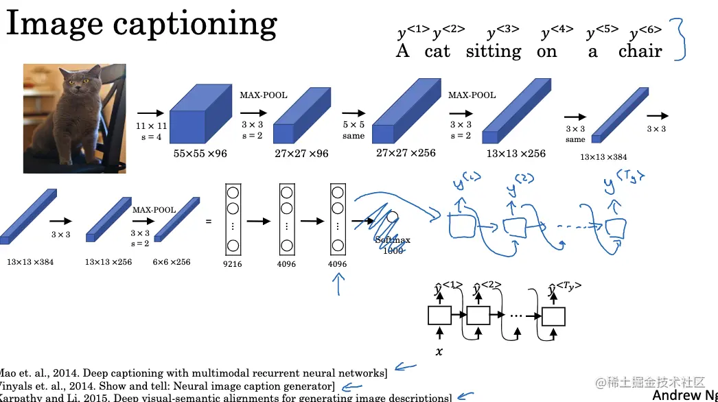 具体来说,首先将图像通过卷积神经网络(如预训练的 AlexNet)进行特征提取,去掉网络最后的 softmax 层,得到一个表示图像信息的固定长度特征向量。然后将该向量输入到解码器(循环神经网络)中,生成图像的文本描述。整个模型依然采用编码器-解码器的架构。这样我们就实现了一个图像到文本的转换,也就是自动图像标注。这展示了序列到序列模型的通用性和广泛适用性。需要注意,序列到序列模型和语言模型有本质区别。语言模型估计句子的联合概率 ,而序列到序列模型估计条件概率 ,即基于特定输入序列,输出特定的翻译或标注序列。这通过编码器来实现条件化。