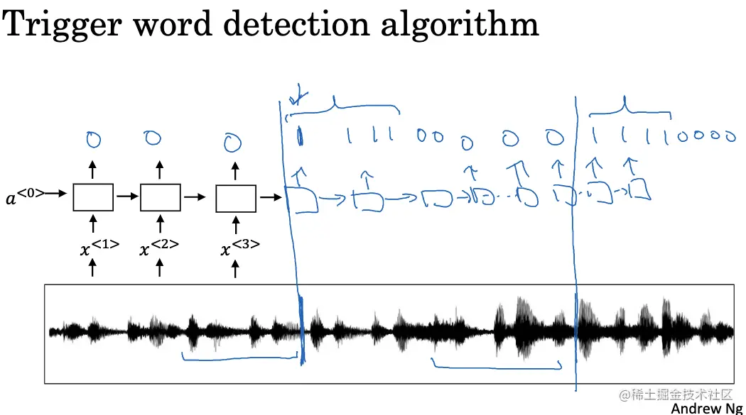 除了语音转文本外,序列到序列模型在语音领域还有其他应用。那就是触发词检测系统。 许多语音助手,如Amazon Echo、Apple Siri、小爱同学等都包含触发词检测功能。当检测到指定的触发词时,系统会启动以提供服务。这需要一个模型来实时分析音频流,判断是否出现了触发词。序列模型非常适合解决这个问题。