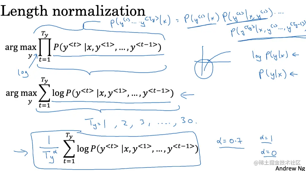 在计算句子概率时,我们需要将各个词的概率连乘。这样很容易导致数值下溢,即得出的概率接近零。为了保证数值稳定,一个方法是取对数,将概率换成对数概率,然后进行累加。 但是这样会导致比例失真——较长的句子由于词的数量多,其概率也会变小,这就会导致算法倾向于选择更短的句子,因为短句子的总概率不会那么小。为平衡这种对长句子的惩罚,我们引入长度归一化,即用句子概率除以句子长度,折算成每个词的平均概率。