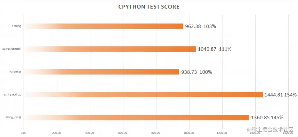 这个结果非常地amazing啊, 一开始我以为最快的会是 string.join (), 结果 % format的方式直接秒杀了一众人,直接比最慢的文本相加快了5.5倍之多.