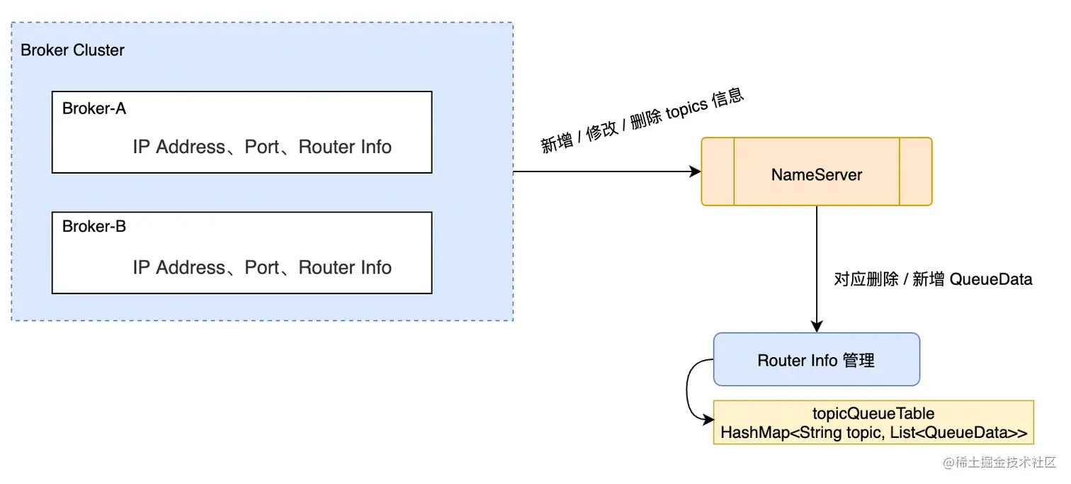 - 如果你修改了Topic,则NameServer 会先把旧的 QueueData 删除,在加一个新的 QueueData。