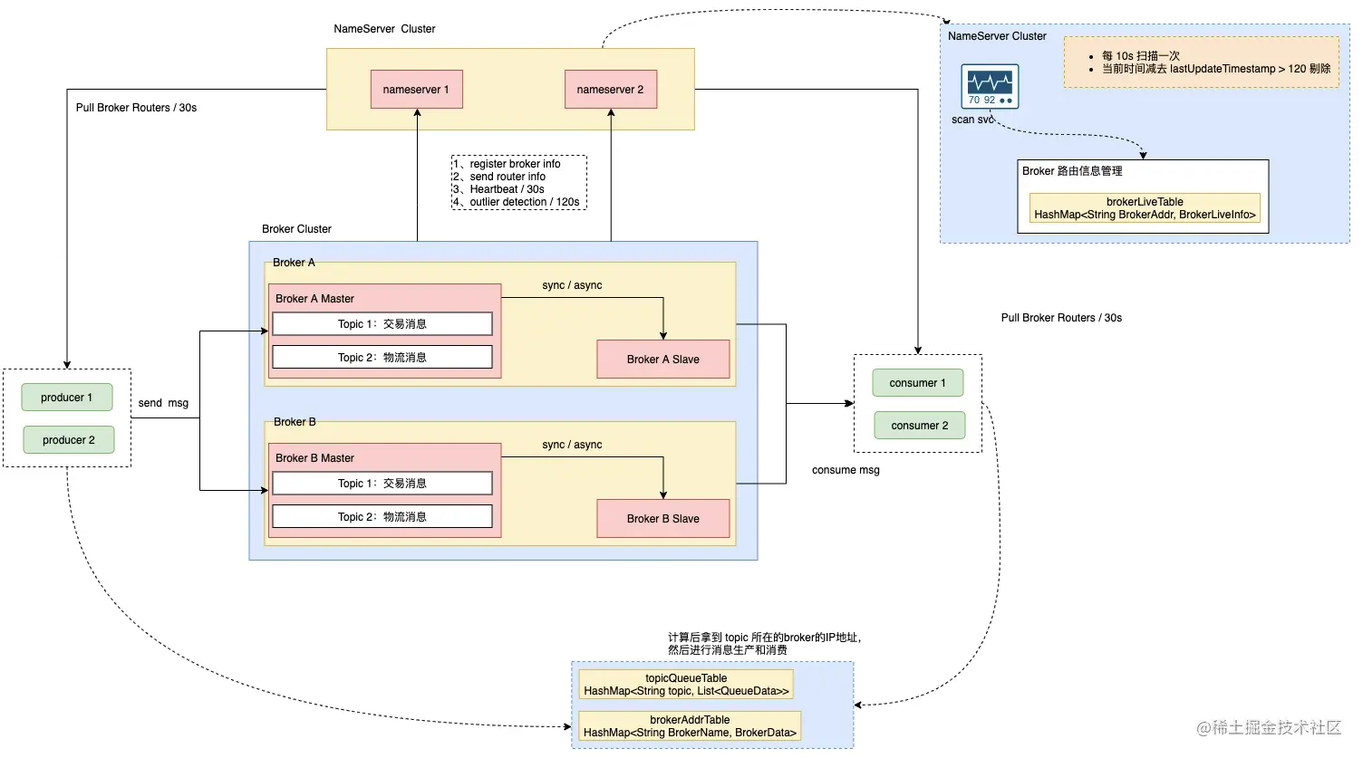 brokerLiveTable表 , 如果检测到某个Broker 宕机(因为使用心跳机制, 如果检测超120s(两分钟)无上报心跳),则从路由注册表中将其移除。 - 生产者在发送某个主题的消息之前先从 NamerServer 获取 Broker 服务器地址列表(通过topic名称查询