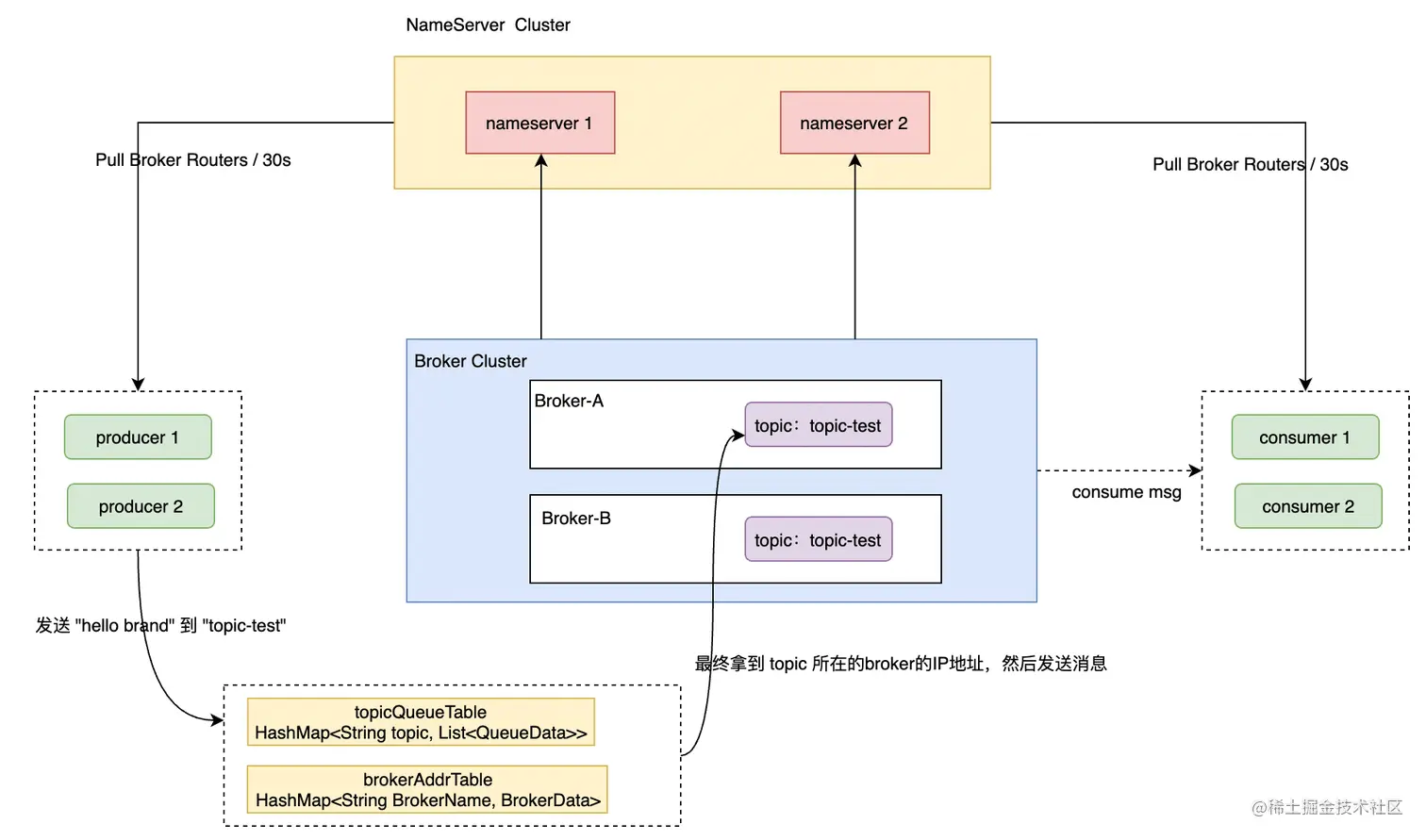 topicQueueTable获得broker名称,通过broker名称查询brokerAddressTable获取具体的Broker IP地址),然后根据负载均衡算法从列表中选择1台Broker ,建立连接通道,进行消息发送。 - 消费者在订阅某个topic的消息之前从 NamerServer 获取 Broker 服务器地址列表(同上),包括关联的全部Topic队列信息。进而获取当前订阅 Topic 存在哪些 Broker 上,然后直接跟 Broker 建立连接通道,开始消费数据。
