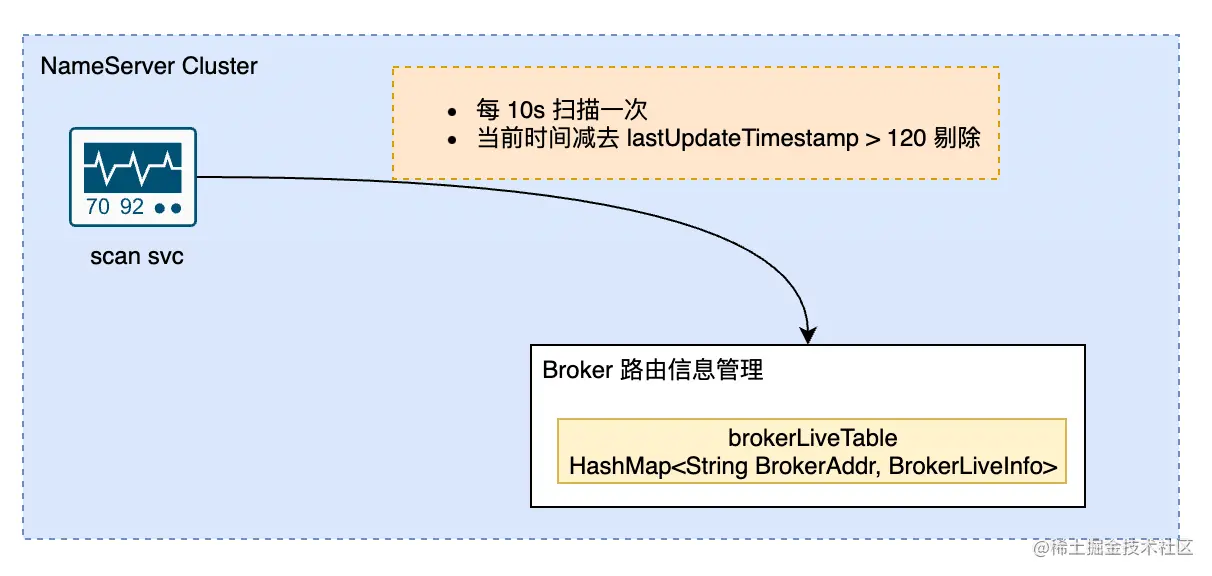 brokerLiveTable表的lastUpdateTimestamp字段中。 - NameServer中会启动一个定时任务