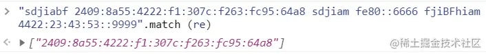 "sdjiabf 2409:8a55:4222:f1:307c:f263:fc95:64a8 sdjiam fe80::6666 fjiBFhiam 4422:23:43:53::9999".match (re)