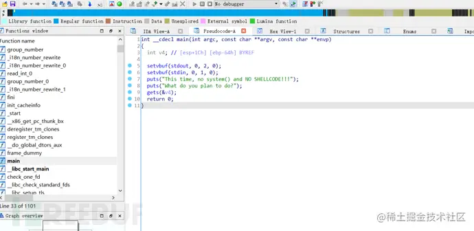 4、找到程序中的puts、write函数。目的是通过这个函数打印程序内存数据、函数地址等。