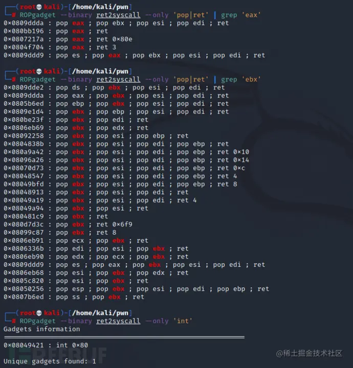 ROPgadget --binary ret2syscall --only 'pop|ret' | grep 'ebx'